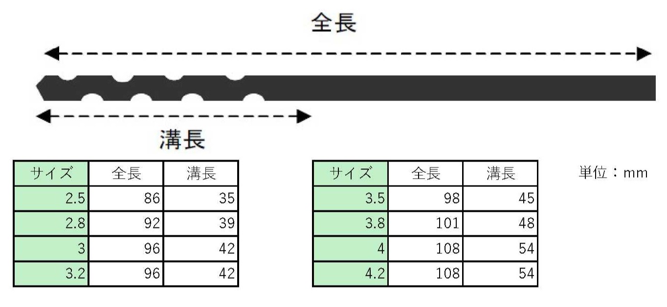 | 全長 | 86~108mm | 溝長 | 35~54mm |