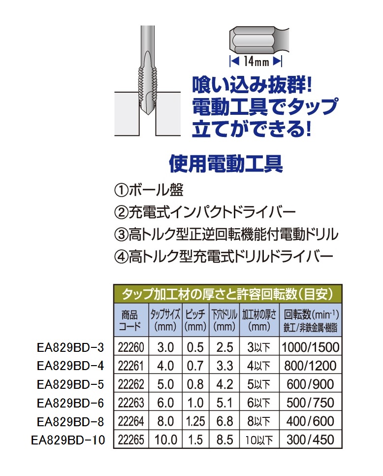 下穴ドリル径 | 3.3mm | 対応加工材厚み | 4mm以下 |