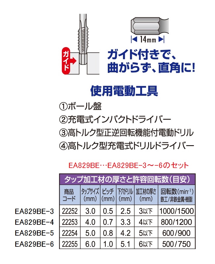 六角軸ガイド付タップ&下穴ドリルセット(貫通穴用) | |||