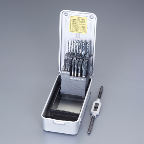 | <セット内容> | ・ドリル(サイズ) φ2.5 φ3.3 φ4.2 φ5.0 φ6.8 φ8.5 φ10.3 (各1本) ・タップ(サイズ) M3×0.5 M4×0.7 M5×0.8 M6×1.0 M8×1.25 M10×1.5 M12×1.75 (ジェットタップ 各1本、スパイラルタップ 各1本) ・タップハンドル |