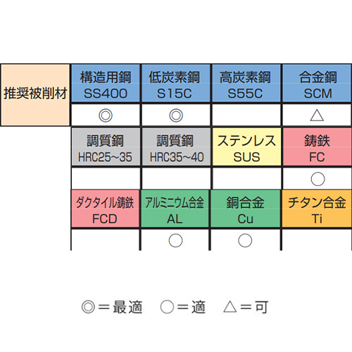 | 対応被削材 | 構造用鋼、低炭素鋼、鋳鉄、アルミニウム合金、銅合金 | ||
