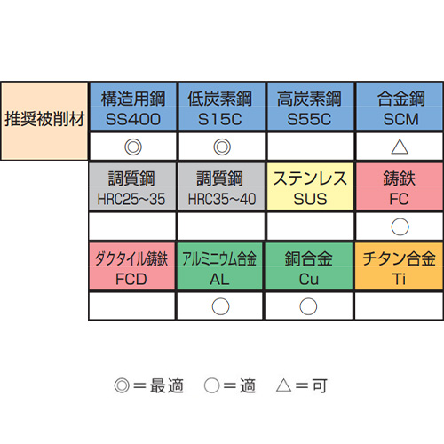 | 総重量 | 510g | 対応被削材 | 構造用鋼、低炭素鋼、鋳鉄、アルミニウム合金、銅合金 |