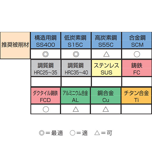 | 対応被削材 | 構造用鋼、低炭素鋼、合金鋼、ダクタイル鋳鉄 | ||