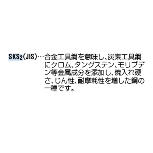 | SKS2(JIS)とは、合金工具鋼を意味し、炭素工具鋼にクロム、タングステン、モリブデン等金属成分を添加し、焼入れ硬さ、じん性、耐摩耗性を増した鋼の一種です。 | |||