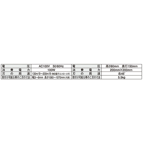 | 鋸刃周速 | 130~200m/分 | 鋸刃サイズ(周長) | 1060mm(幅3~6mm) |