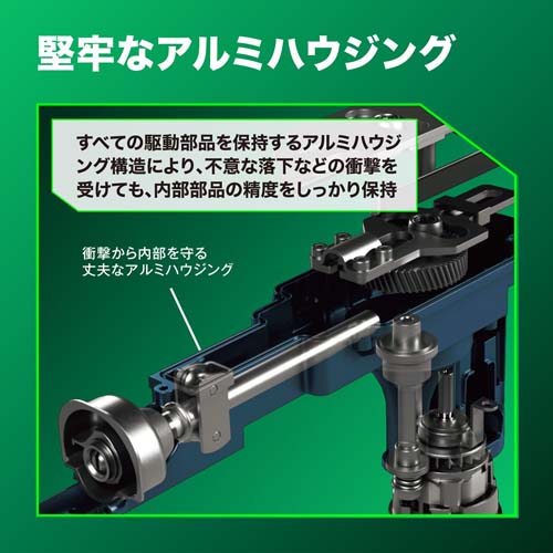 | すべての駆動部品を保持するアルミハウジング構造により、不意な落下などの衝撃を受けても、内部部品の精度をしっかり保持。 | |||
