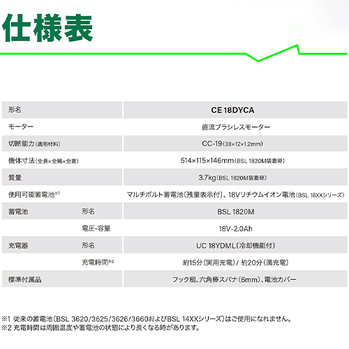 | 切断能力 | CC-19(38×12×1.2mm) | 1充電当たりの作業量目安(BSL1820M使用時) | 約300カット (※数値は参考値です。材料や条件により異なります。) |
