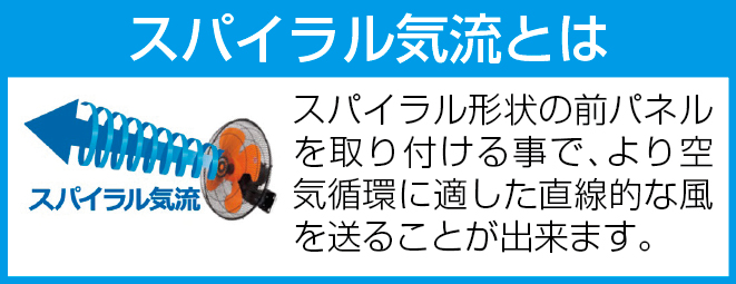 | スパイラル形状の前カバーを付けることで強力スポット送風を実現、より遠くへ風を送る工業扇風機 据え置き型です。 | |||