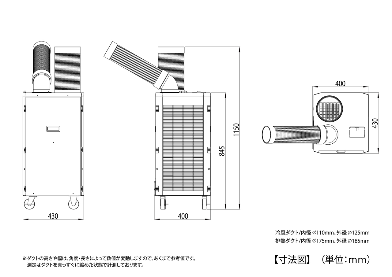 | 付属品 | ・冷風ダクト×1本 ・冷風ダクト用エルボ×1個 ・排熱ダクト×1本 ・ドレンホース×1本 |