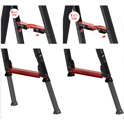 | 伸縮脚435mmの調整を立ったままできるという進化とステップ幅60mmによる安心感を併せ持った新型脚立。 | |||