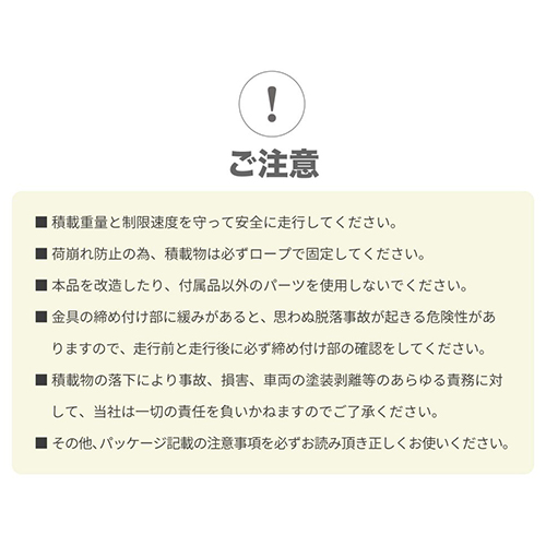| 【注意事項】 ・積載重量と制限速度を守って安全に走行してください。 ・荷崩れ防止の為、積載物は必ずロープで固定してください。 ・本品を改造したり、付属品以外のパーツを使用しないでください。 ・金具の締め付け部に緩みがあると、思わぬ脱落事故が起きる危険性がありますので、走行前と走行後に必ず締め付け部の確認をしてください。 ・積載物の落下により事故、損害、車両の塗装剥離等のあらゆる責務に対して、当社は一切の責任を負いかねますのでご了承ください。 ・その他、パッケージ記載の注意事項を必ずお読み頂き、正しくお使いください。 |