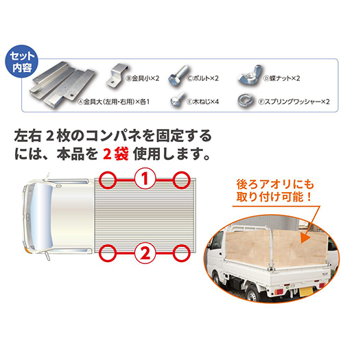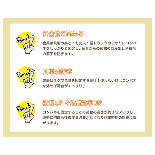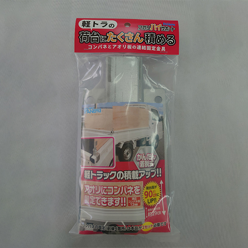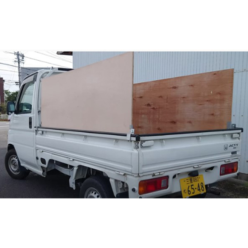 | 丈夫な鉄製の金具で軽トラックのアオリにコンパネをしっかりと固定し、荷台からの荷物のはみ出しや積荷の落下を防ぎます。 | |||