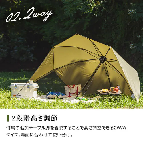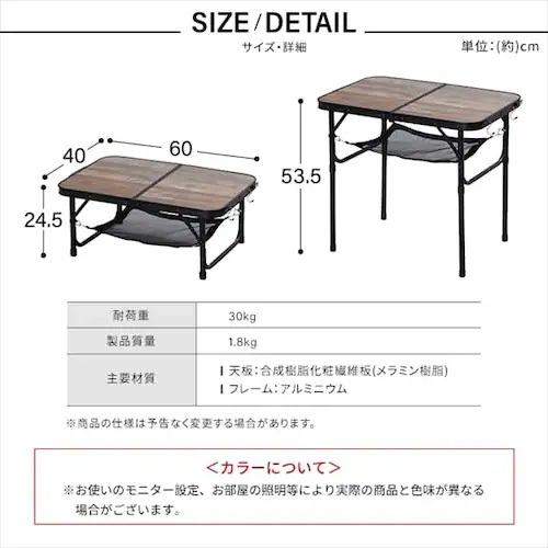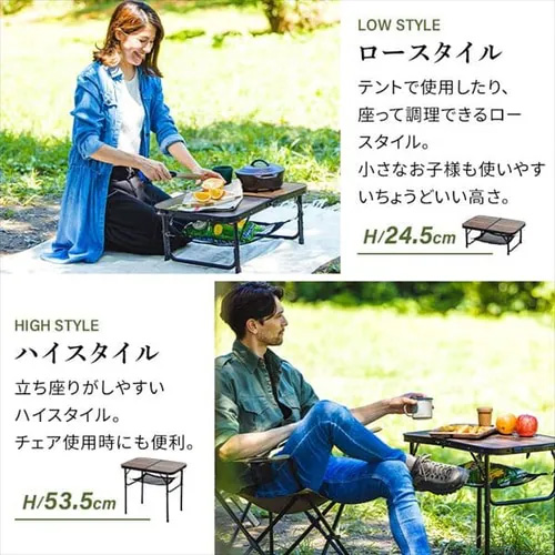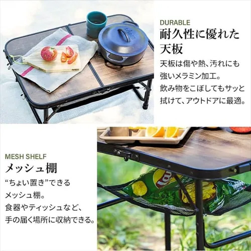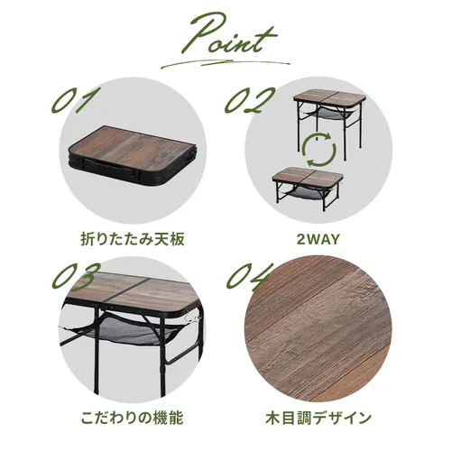 | 屋外に馴染む木目調デザインで、テーブルの高さ調整が可能なフォールディングテーブルです。 | |||