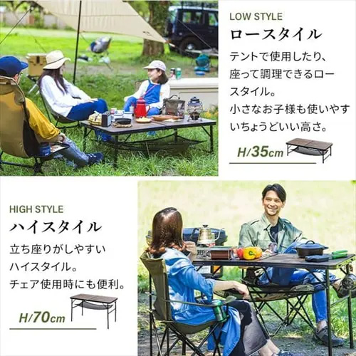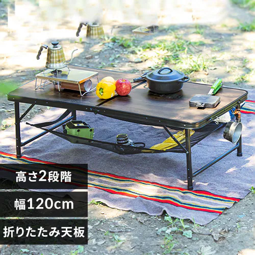 | 屋外に馴染む木目調デザインで、テーブルの高さ調整が可能なフォールディングテーブルです。 | |||