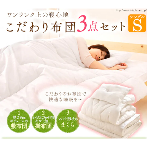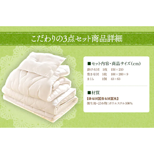 セット内容 | 掛布団(150×210cm) 敷布団(100×210cm) 枕(43×63cm) |
