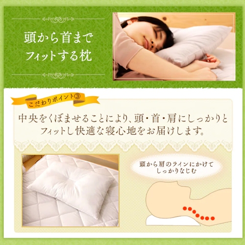 中央をくぼませることにより、頭・首・肩にしっかりとフィットする枕 | |||