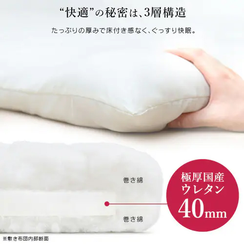 ◆ 低反発ウレタン入り3種構造敷きふとん ふんわり柔らか寝心地。 包み込まれるような感覚で、じんわり支えます。 |