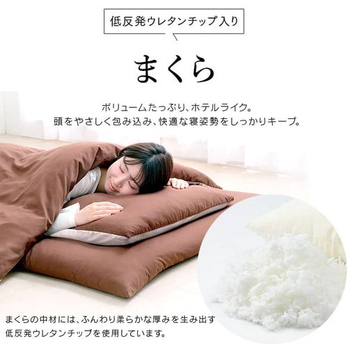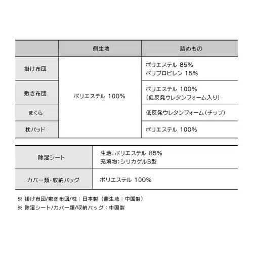 材質 | 掛布団:側生地:ポリエステル100%、詰めもの:ポリエステル85%、ポリプロピレン15% 敷布団: 側生地:ポリエステル100%、詰めもの:ポリエステル100%(低反発ウレタンフォーム入り) 枕:側生地:ポリエステル100%、詰めもの:低反発ウレタンフォーム(チップ) カバー・シーツ・収納バッグ:ポリエステル100% 枕パッド:側生地:ポリエステル100%、詰めもの:ポリエステル100% 除湿シート:ポリエステル100% |