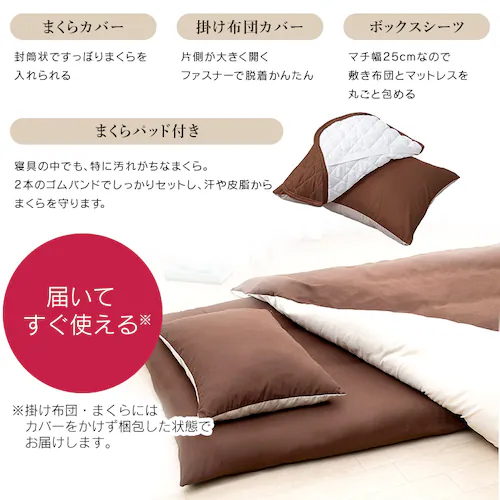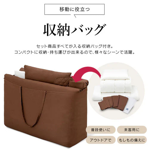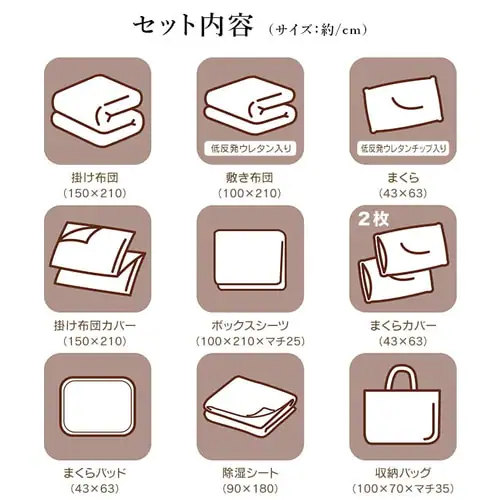 セット内容 | 掛布団(150×210cm) 敷布団(100×210cm) 枕(43×63) 掛布団カバー(150×210cm) ボックスシーツ(100×210×マチ幅25cm) 枕カバー(43×63cm/2枚) 枕パッド(43×63cm) 除湿シート(90×180cm) 収納バッグ(100×70×マチ幅35cm) |