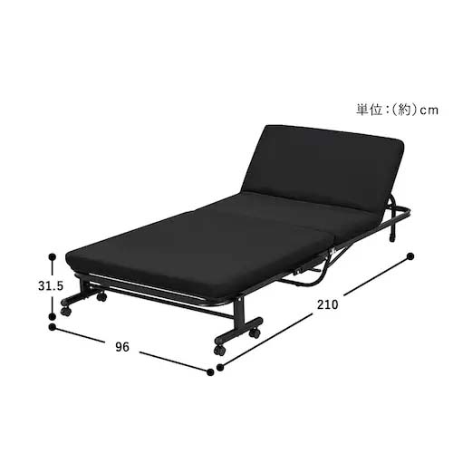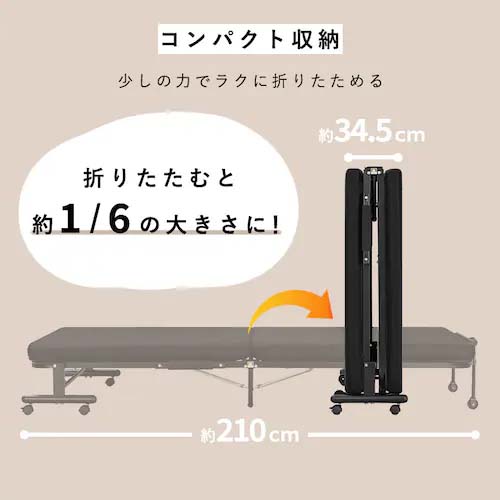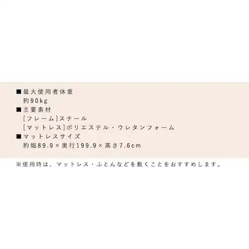 | 収納時サイズ | 960(W)×345(D)×1085(H)mm | マットレスサイズ | 899(W)×1999(D)×76(H)mm |