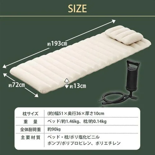 | 耐荷重(kg) | 90 | 材質 | ベッド・枕:ポリ塩化ビニル(上面のみフロッキー加工) ポンプ:ポリプロピレン、ポリエチレン |
