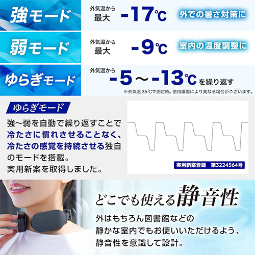 | 炎天下に最適な【強モード】、屋内で使いやすい【弱モード】に加え、冷たさに慣れるのを防ぐ実用新案取得の【ゆらぎモード】を搭載。 強弱を自動で繰り返す独自の技術で、心地よいひんやり感を維持します。 | |||