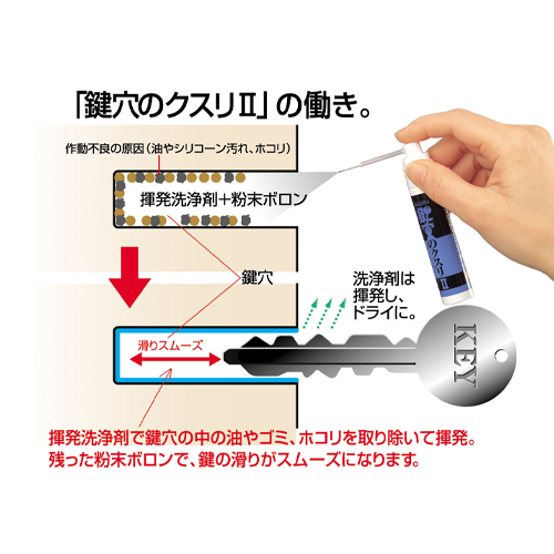 | 石油系揮発洗浄剤を配合し、鍵穴の汚れを洗浄します。 | |||