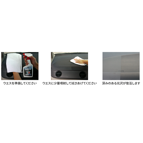 | ・自動車のダッシュボード、タイヤ、クロームメッキ、各種内張りなどのプラスチック・ゴム・合成皮革部分の保護つや出しに ・家具や電化製品などのプラスチック・ゴム・合成皮革部分のつや出しに |
