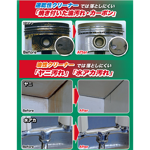 | 複合アルカリ成分と準水系洗浄成分が速乾性クリーナーでは落としにくい、焼き付いた頑固な油汚れを化学的に変化させて分解・洗浄します。 油性クリーナーでは落としにくいカーボン・ヤニ・泥汚れにも強力な洗浄効果を発揮します。 |