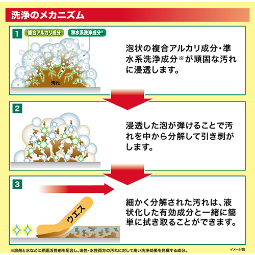 | 特殊作用で泡から液状に変化する洗浄成分が汚れを素早く引き剥がしながら浸透し、微細な凹凸に入り込んだ汚れまで強力に洗浄します。 | |||