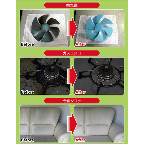 | スプレーして拭き取るだけの簡単作業で頑固な汚れを落とします。 | |||