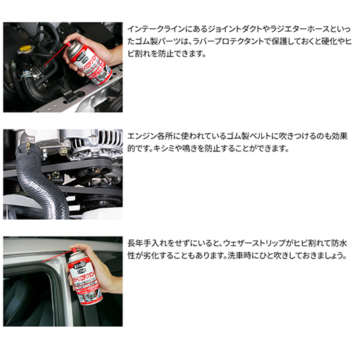| エアダクトホース、ラジエターホース、ブレーキホース、プラグコード、ディストリビューターカバー、ファンベルト、ウェザーストリップ、タイヤ側面などゴム製パーツの清浄・保護・劣化防止に | |||
