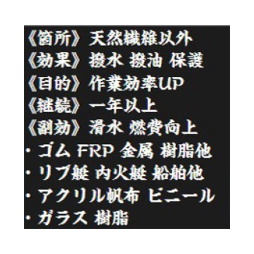 | ※車のフロントガラス、サイドミラー、ボディには塗りにくいのでおすすめしません。 車のエンジンやタイヤ廻りの様な摩擦が多い所、泥はね、船底の海水が当たる部分等もっと効果を求めたい所に向いています。 |