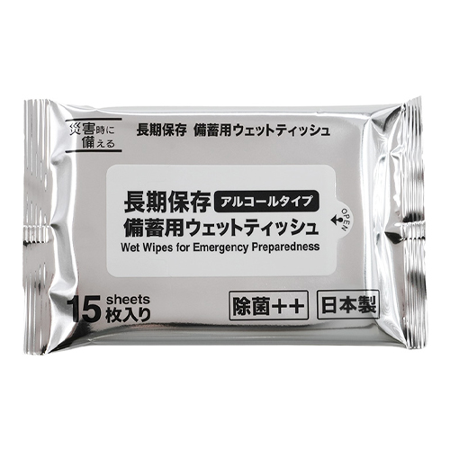 | 用途 | 災害時、断水時の手指の清拭、身の回り品の除菌などに。 | サイズ | 200×150mm |
