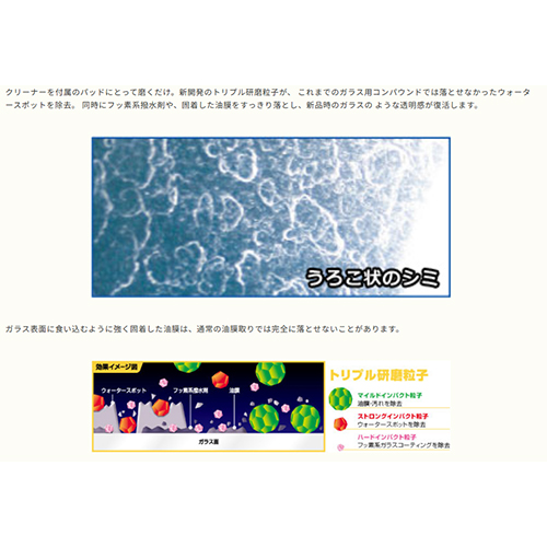 | クリーナーを付属のパッドにとって磨くだけで、フッ素系撥水剤・固着した油膜・ウォータースポットをすっきり落とし、新品時のガラスの ような透明感が復活します。 | |||