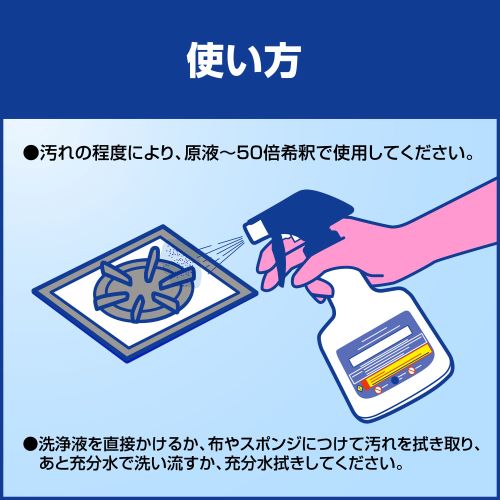 | 用途 | ガスレンジ・レンジフードなどの焼きつき汚れ、フライヤー、厨房機器まわりの床や壁などのべたつき汚れ、厨房内の軽い油汚れなどに。 | ||