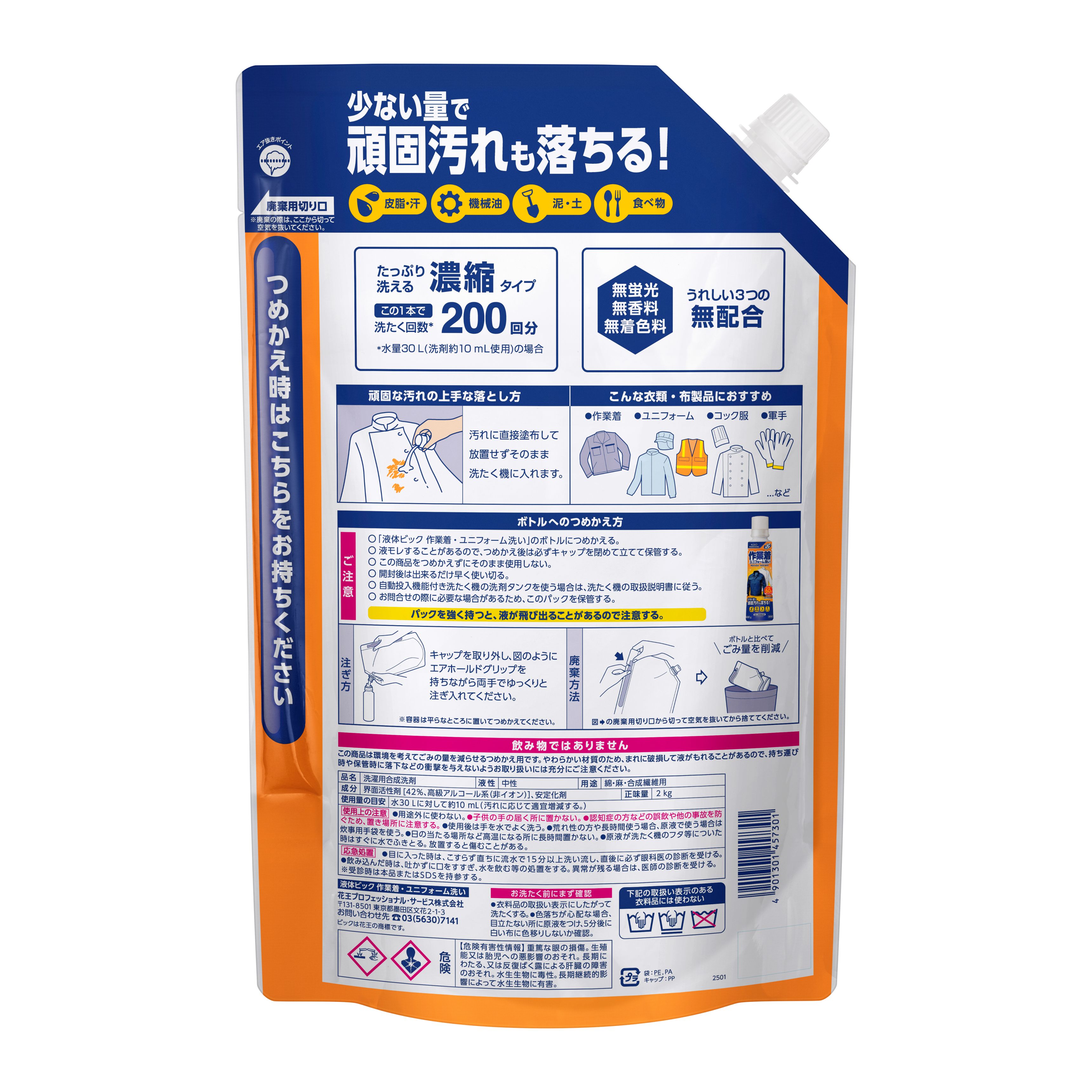 | メーカー | 花王プロフェショナル | 商品名 | 液体ビック 作業着・ユニフォーム洗い つめかえ用2kg |
