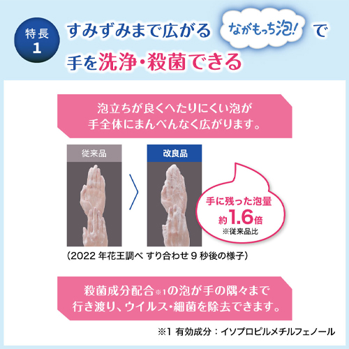 | 1プッシュでも洗浄中へたりにくい「ながもっち泡」で、手指のすみずみまで洗いやすい泡タイプのハンドソープです。 | |||
