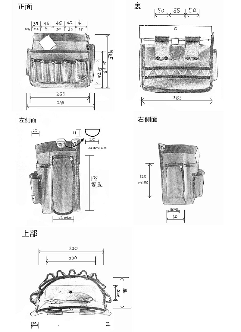 | 特長 | 使用時にダメージを受けやすいポケットの取り出し部分をPPテープで補強。 ポケットのよれ防止にも効果を発揮。 力のかかる部分は、カシメで補強。 Dリング機能付…セーフティーコードが装着可能なので、工具の落下防止に最適。 アイデア次第で多目的に使える機能です。 前面ポケットは底は開いています。ドライバーなどを挿すのに便利です。 水抜き穴が付いています。 |