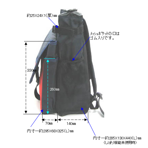 | サイズ | 300×210×450(H)mm(しぼり機能使用時600(H)mm) | 材質 | 表面:高品質ポリエステル 裏面:PVCコーティング加工・ナイロンタフタ、 背面:ナイロンクッションメッシュ 底部:エストロン、発泡ポリエチレン |