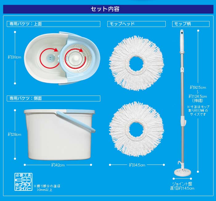 | 名称 | モップ・洗浄バケツセット | モップサイズ | φ345×925~1245(H)mm |