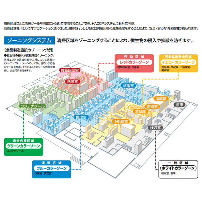 | 管理区域ごとに清掃ツールを色分けすることで、効果的な衛生管理が可能です。 | |||