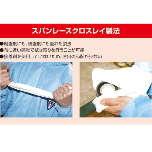 厳選した原料と特殊製法によりメリヤスウエスのような柔らかさを実現しつつ、発塵を大幅に抑えた素材です。 | |||