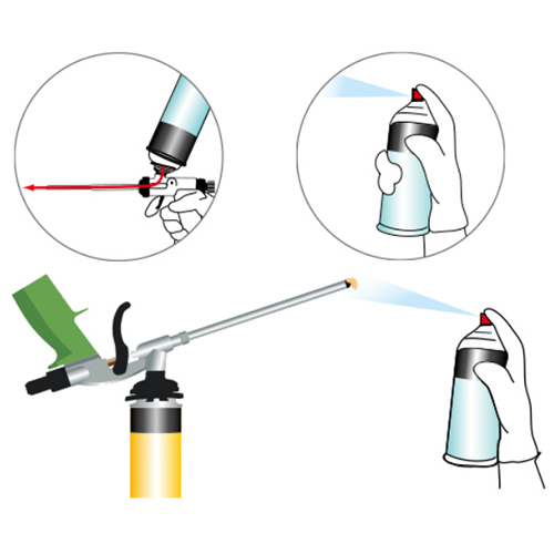 | ・ガンに取り付けてガン内部の洗浄に ・付属の赤いスプレーノズルを使用し、ガン先や余剰フォームの洗浄に |