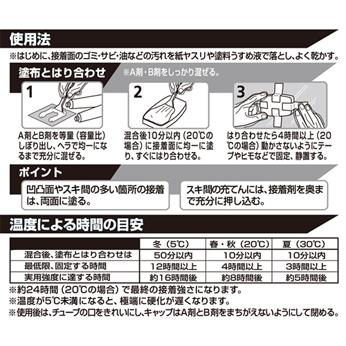 | 【使用上のポイント】 主剤と硬化剤を等量よく混ぜ合わせる。 混合後10分以内にはり合わせ、4時間以上固定・静置する。 |