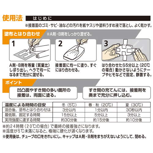 | 【使用上のポイント】 主剤と硬化剤を等量よく混ぜ合わせる。 混合後1分以内にはり合わせ、5分以上固定・静置する。 |