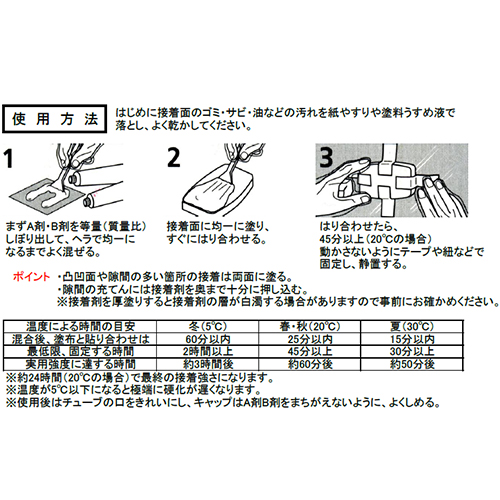 | 【使用上のポイント】 主剤と硬化剤を等量よく混ぜ合わせる。 混合後25分以内にはり合わせ、45分以上固定・静置する。 |