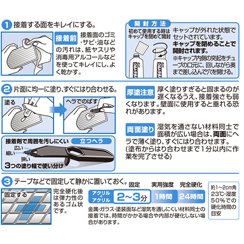 | 〈使用方法〉 ①接着する面をキレイにする。 ②片面に均一に塗布し、すぐにはり合わせる。 ③テープなどで固定して静かに置いておく。 ※約2~3分で動きづらくなり、実用強度は1時間後、約24時間で完全硬化します。(アクリル同士:約1~2cm角・23℃・湿度50%) |