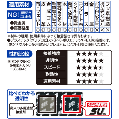 | 【適用材質】 布・フェルト、皮革、合成ゴム、軟質塩化ビニール、硬質プラスチック、木材、発泡スチロール、タイル・陶磁器、コンクリート・石、ガラス、金属 (※接着できないもの:ポリプロピレン、ポリエチレン、フッ素樹脂、貴金属、高価格品) |