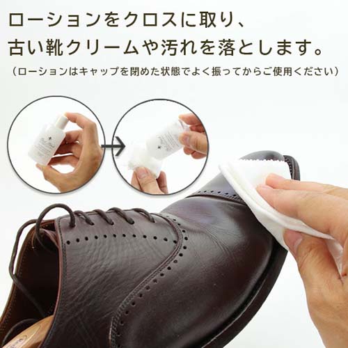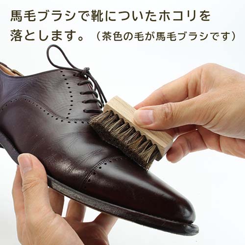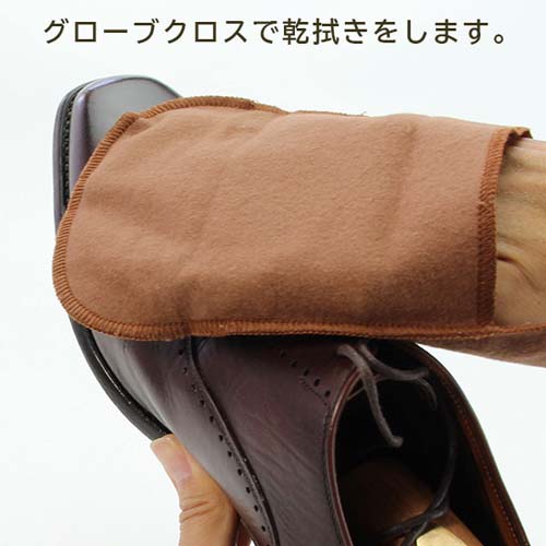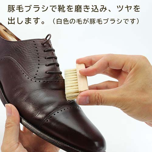 | セット内容 | ・保革・ツヤ出し用シュークリーム(30g・ニュートラル)×1 ・汚れ落とし用ツーフェイスローション(30ml)×1 ・ホコリ落とし用ミニ馬毛ブラシ(毛:茶色)×1 ・磨き込み用ミニ豚毛ブラシ(毛:白色)×1 ・クロス×1 ※起毛面をご使用下さい。 ・グローブクロス×1 |